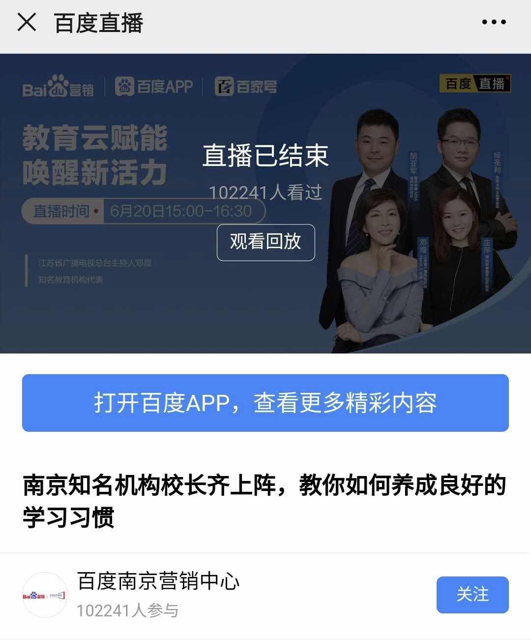 6月20日,百度營銷聯(lián)合江蘇廣播、厚學(xué)網(wǎng)發(fā)起的“教育云賦能 喚醒新活力”——百度營銷助力南京教育培訓(xùn)業(yè)復(fù)蘇公益計(jì)劃直播專場(chǎng)圓滿落幕。