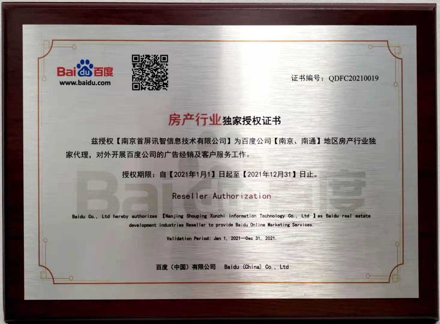 會(huì)上,百度公司正式授權(quán)南京首屏訊智信息技術(shù)有限公司為南京、南通地區(qū)房產(chǎn)行業(yè)獨(dú)家代理商及百度房產(chǎn)平臺(tái)南京、南通地區(qū)獨(dú)家運(yùn)營(yíng)商,并頒發(fā)授權(quán)證書。首屏訊智自2004年成為百度合作伙伴,始終致力于為廣大企業(yè)提供優(yōu)質(zhì)的互聯(lián)網(wǎng)營(yíng)銷服務(wù)。擁有17年豐富互聯(lián)網(wǎng)行業(yè)服務(wù)經(jīng)驗(yàn)的首屏訊智,已服務(wù)南京企業(yè)2萬(wàn)余家,助力廣大企業(yè)快速穩(wěn)健發(fā)展。